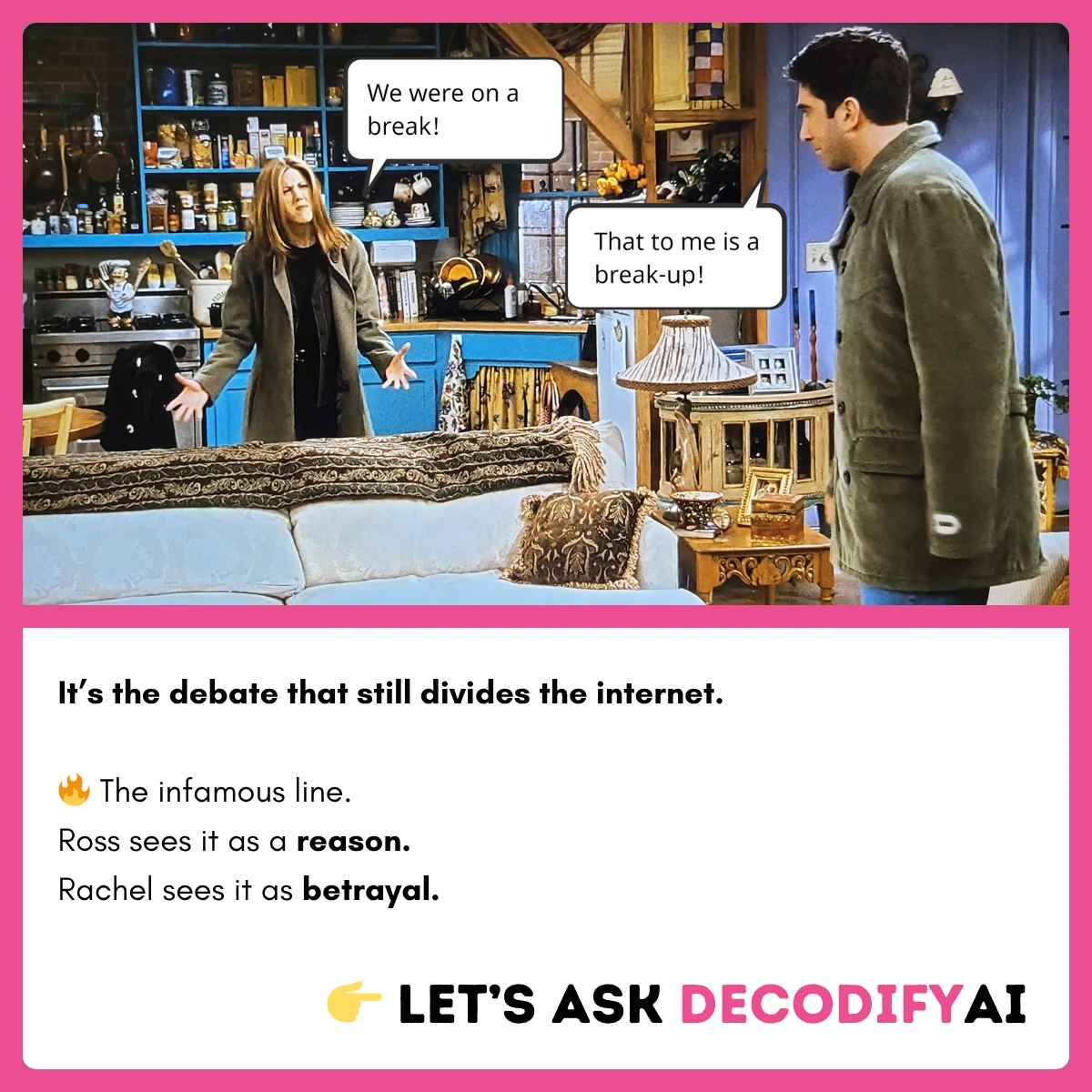 It's the debate that still divides Friends fans across the internet. That infamous line. Ross sees it as a reason. Rachel sees it as betrayal.